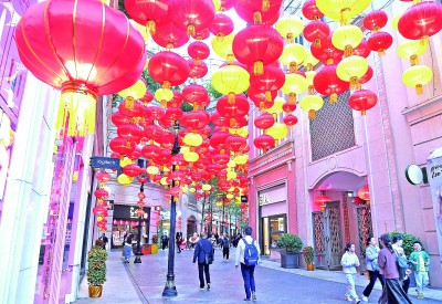 人们在张灯结彩年味儿浓郁的香港利东街逛街购物。新华社发