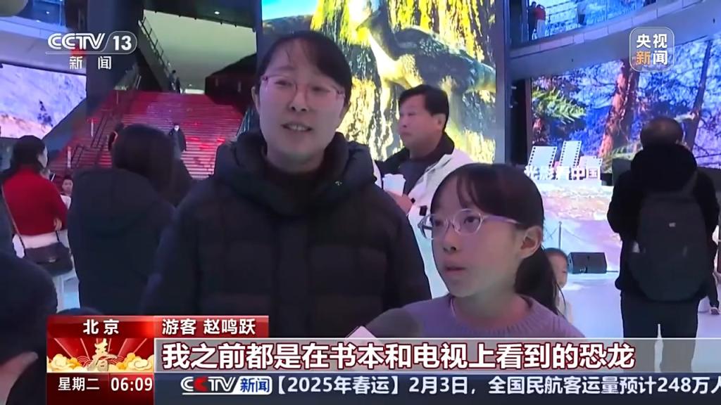 春节期间循环播放的恐龙科学艺术展、春节主题展、春节档电影精编等“四屏联动”原创视频,将光影资源与科教文化有机融合。特别是恐龙科学艺术展深受小朋友喜爱,展览现场,巨幅卷轴屏以直观的方式展现恐龙的样貌与庞大体形,邀请观众与这些史前巨兽“比高”。环屏则将播放引人入胜的动画视频,生动再现侏罗纪中期恐龙的生活场景,让观众仿佛可以跟随恐龙的步伐,重返远古世界。
